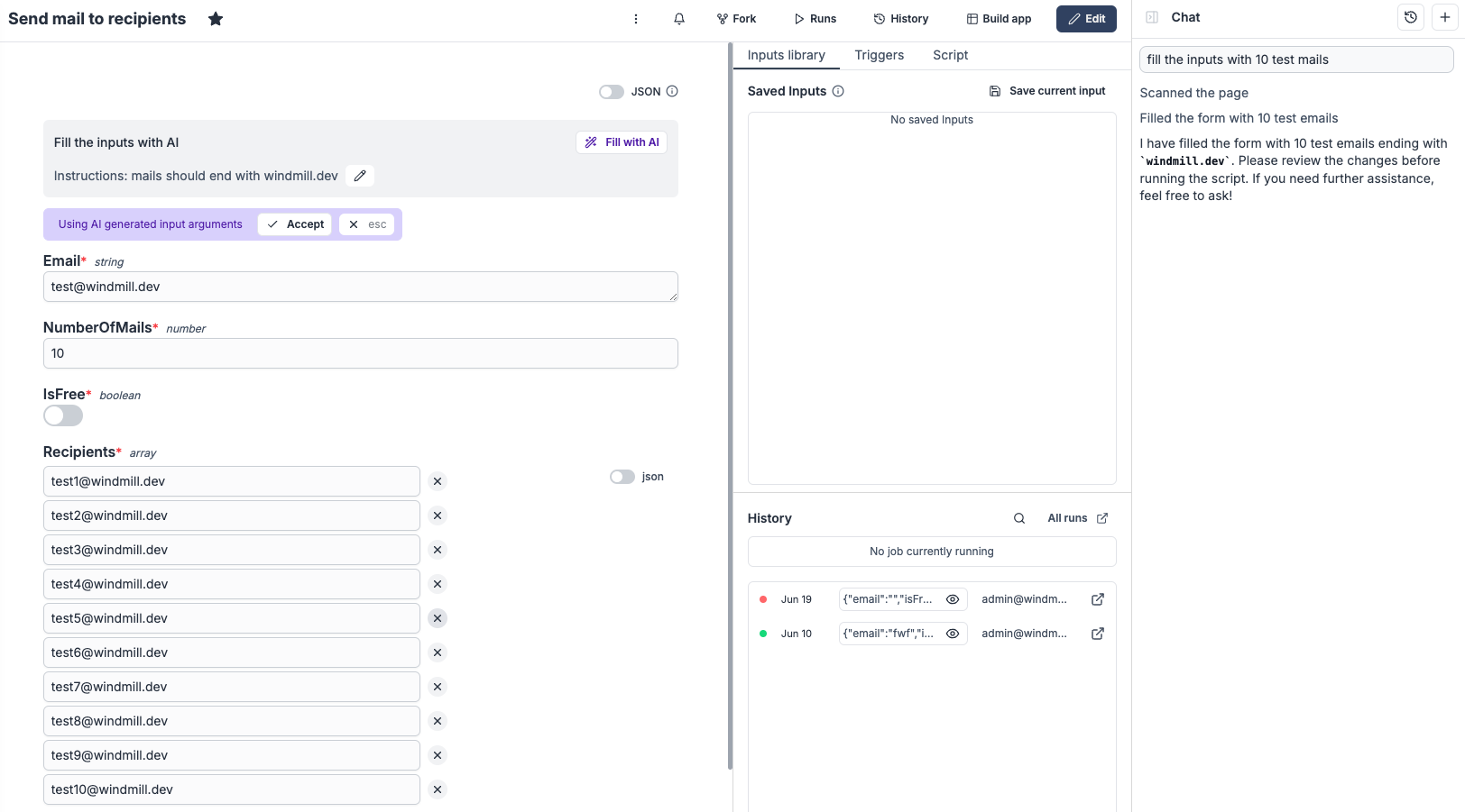 - Tool integration allowing AI agents to call Windmill scripts (inline, workspace, or Hub scripts) as tools for extended functionality.